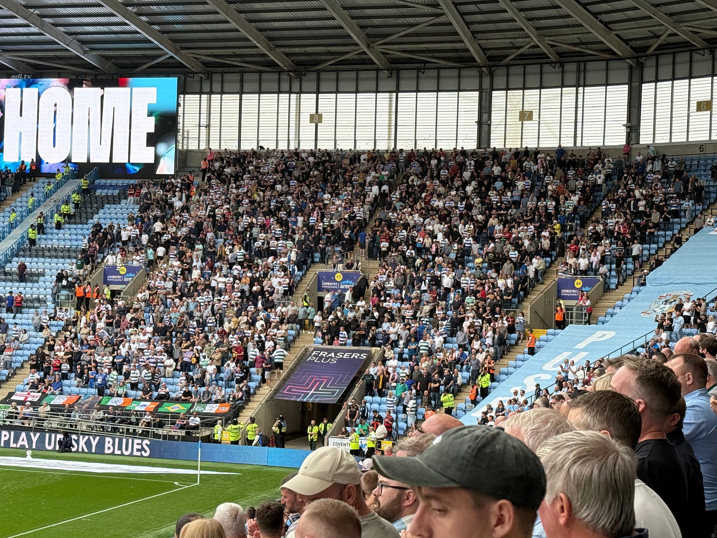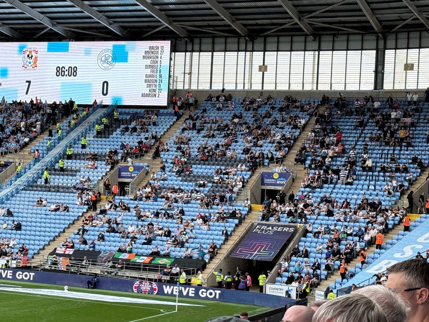 Which brings me to another reason it would be unfair to lay all the blame at the feet of the manager: some of the players were just phoning it in, particularly in the first 45 minutes. I’m not sure I’ve ever seen a poorer first half performance by QPR – and I went to a lot of games when Gareth Ainsworth was in charge. Even with a slight improvement in the second half, we still conceded two more goals, leading to our worst result since 2018, when we lost 7-1 to West Brom. Not surprisingly, the almost 1,800 away fans that made the trip to the Coventry Building Society Arena had dwindled to about a fifth of that towards the end, as you can see from these two pictures.
