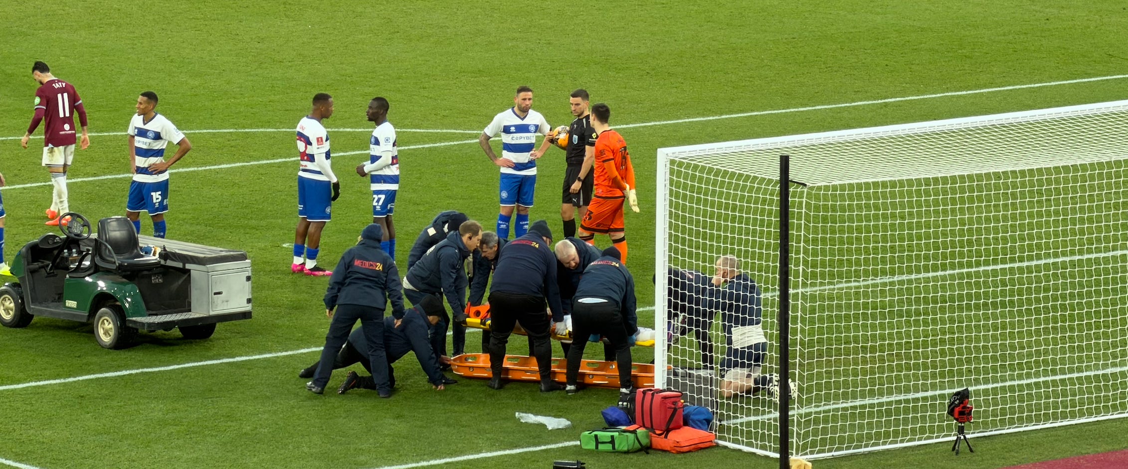After 10 minutes or so, we began to settle into the game, having discovered the hosts are quite brittle under pressure. A QPR corner in the 9th minute ended with a Kolli header into the side netting that didn’t look that far away – although it was hard to tell without a telescope. Throughout the first half, the hosts spent far too much time passing it from side to side in the centre of the park, to the increasing irritation of their fans.